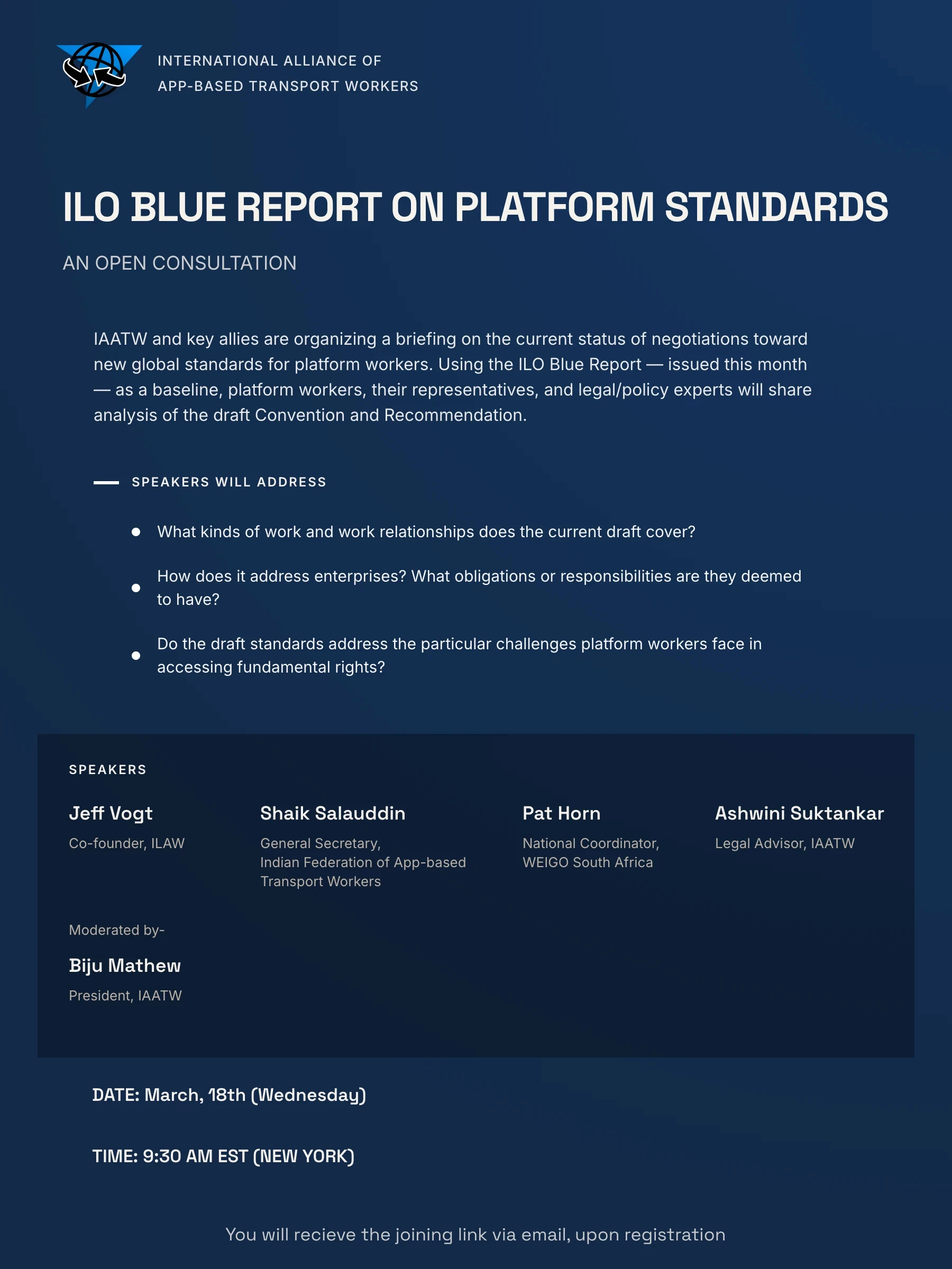 IAATW and key allies are organizing a briefing on the current status of negotiations toward new global standards for platform workers. Using the ILO Blue Report — issued this month — as a baseline, platform workers, their representatives, and legal/policy experts will share analysis of the draft Convention and Recommendation.